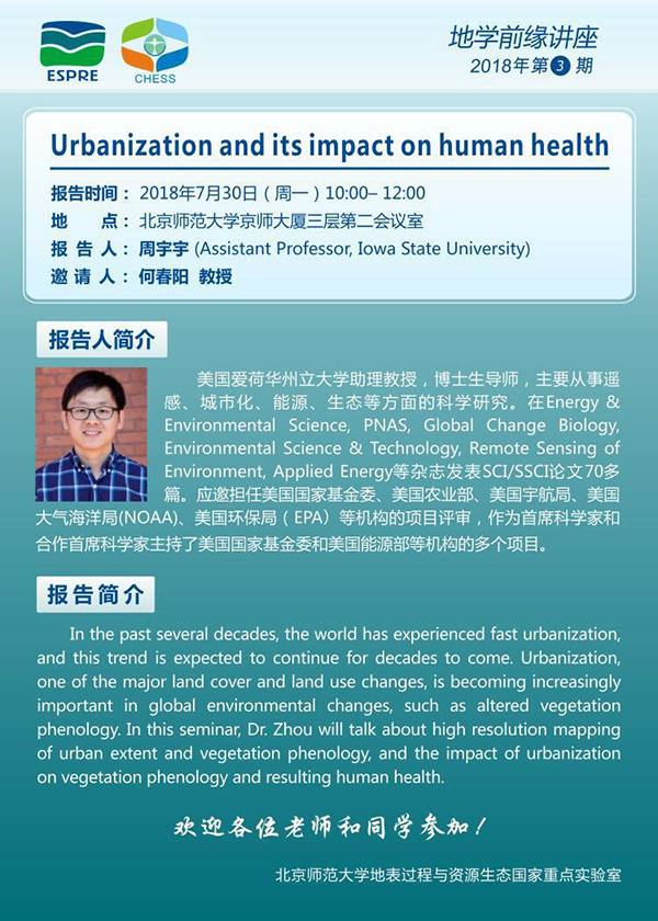 【7月30日讲座】周宇宇:Urbanization and its impact on human health
