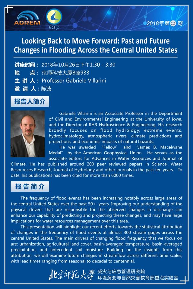 【10月26日讲座】Professor Gabriele Villarini:Looking Back to Move Forward: Past and Future Changes in Flooding Across the Central United States