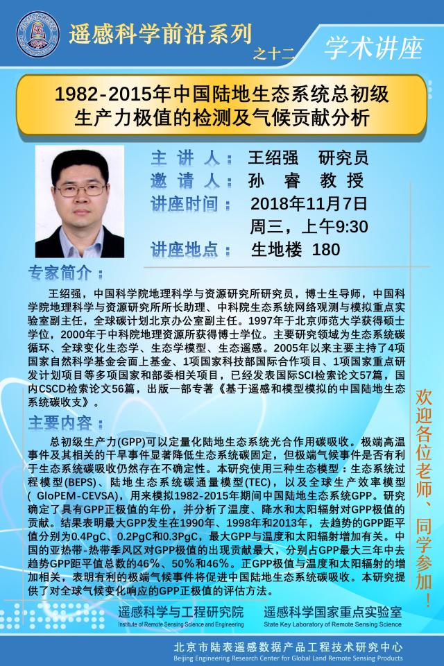【11月7日讲座】王绍强:1982-2015年中国陆地生态系统总初级生产力极值的检测及气候贡献分析