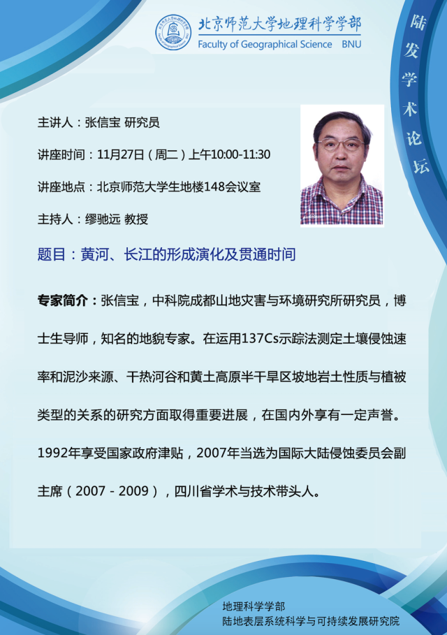 【11月27日讲座】张信宝:黄河、长江的形成演化及贯通时间