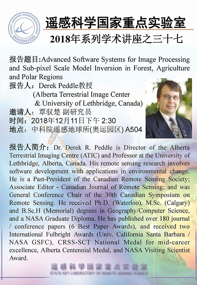【12月11日讲座】Derek Peddle,Advanced Software Systems for Image Processing and Sub-pixel Scale Model Inversion in Forest, Agriculture and Polar Regions