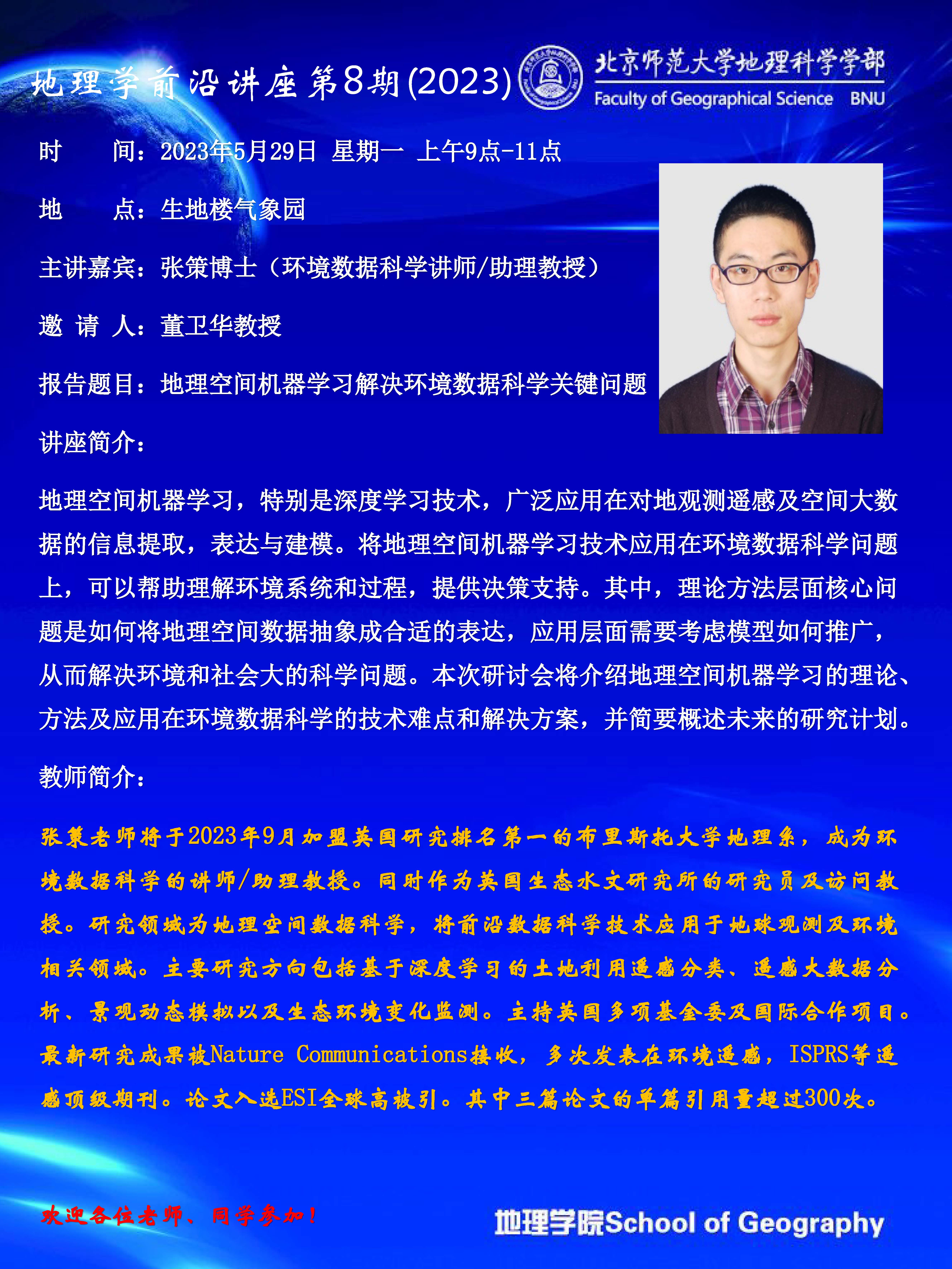 【5月29日】地理学前沿讲座第8期(2023)张策:地理空间机器学习解决环境数据科学关键问题
