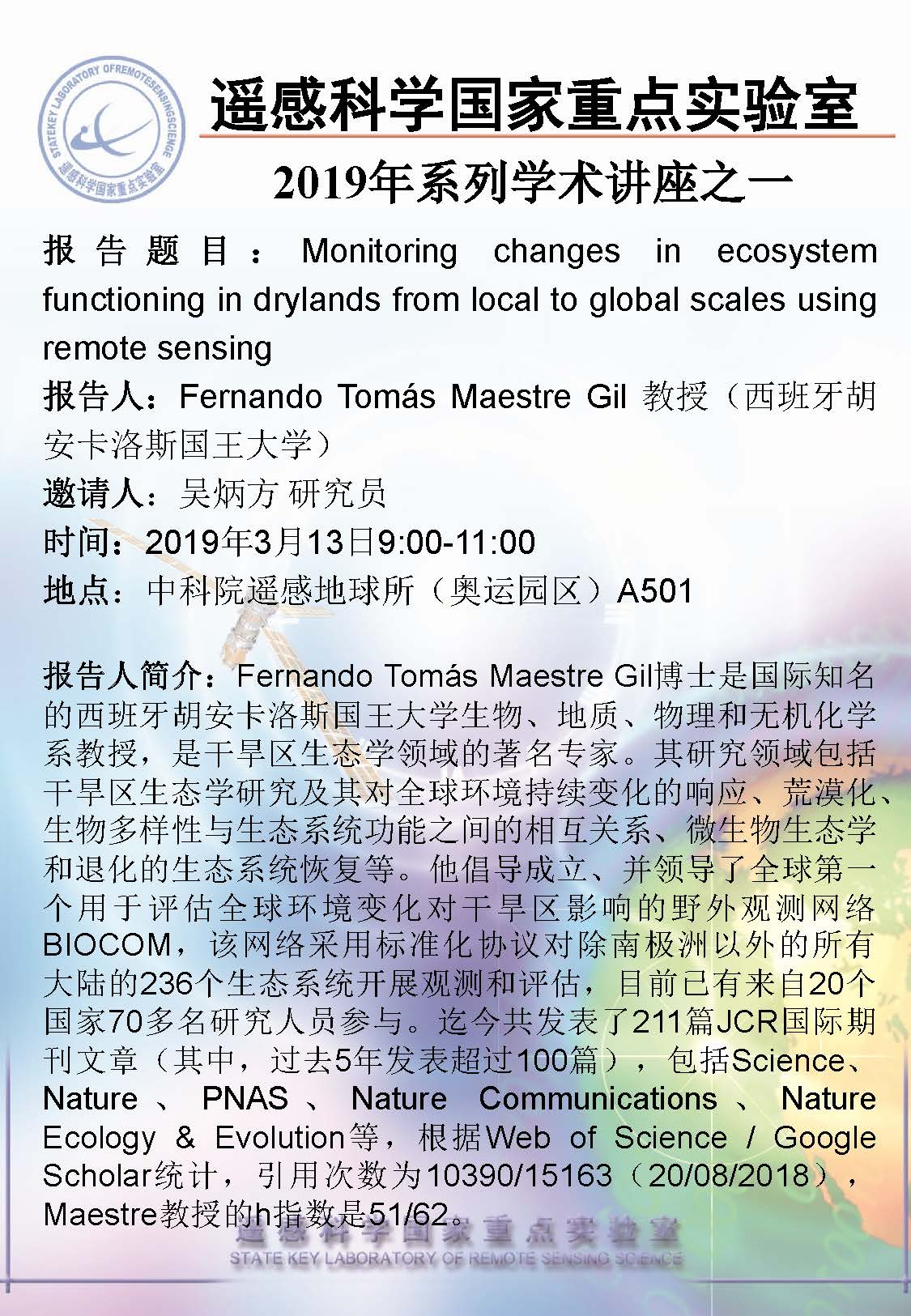【3月13日讲座】Fernando Tomás Maestre Gil,Monitoring changes in ecosystem functioning in drylands from local to global scales using remote sensing