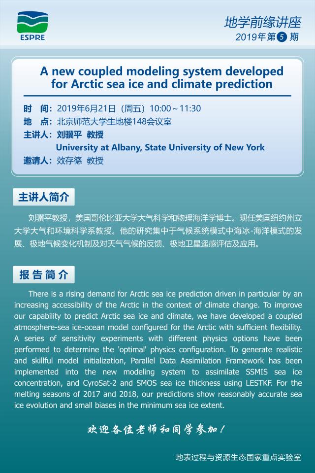 【6月21日讲座】刘骥平, A new coupled modeling system developed for Arctic sea ice and climate prediction