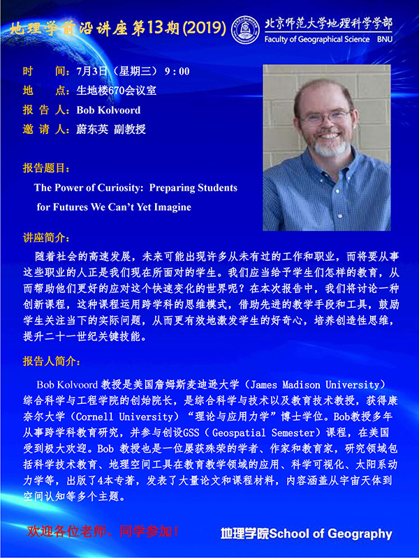 【7月3日讲座】地理学前沿讲座第13期(2019)Bob Kolvoord:The Power of Curiosity: Preparing Students for Futures We Can’t Yet Imagine