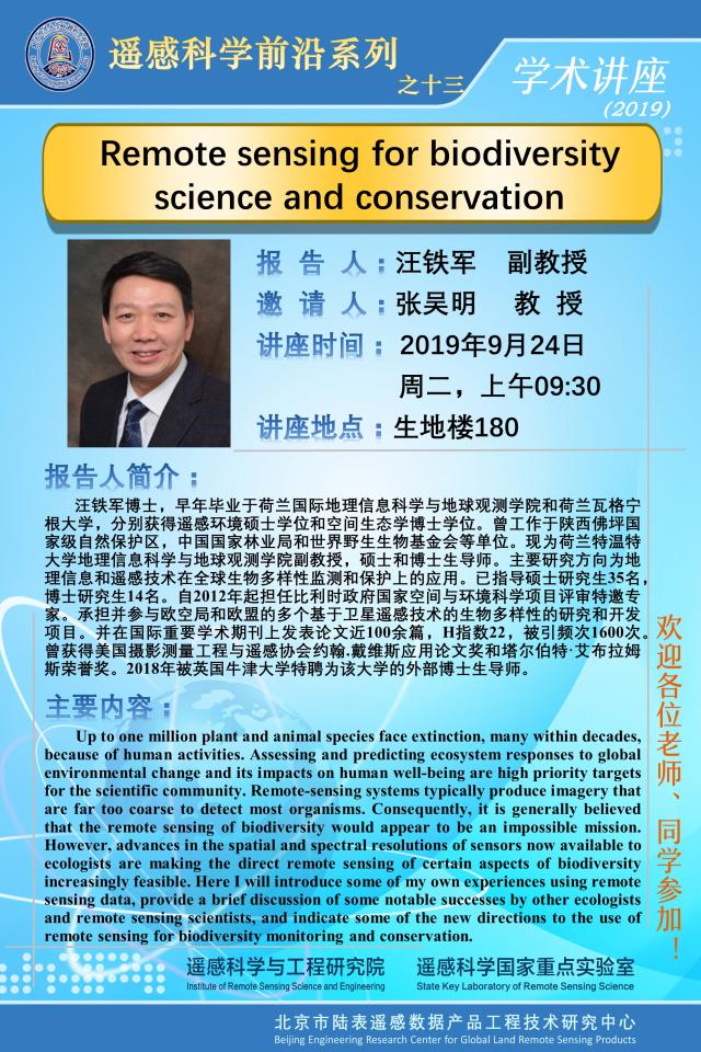 【9月24日讲座】汪铁军,Remote sensing for biodiversity science and conservation