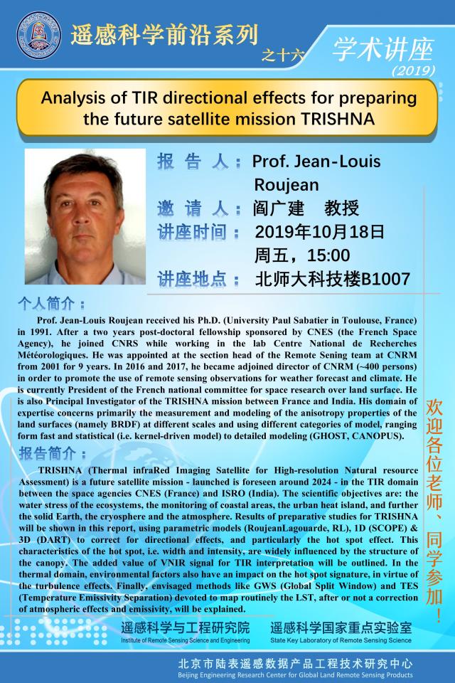 【10月18日讲座】Prof. Jean-Louis Roujean,Analysis of TIR directional effects for preparing the future satellite mission TRISHNA