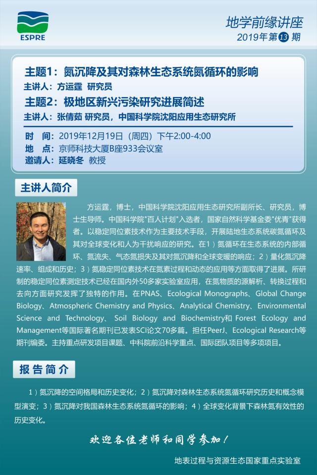【12月19日讲座】方运霆,氮沉降及其对森林生态系统氮循环的影响