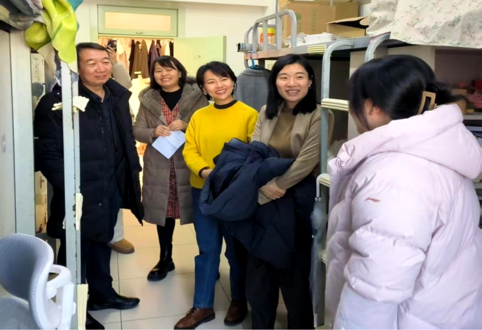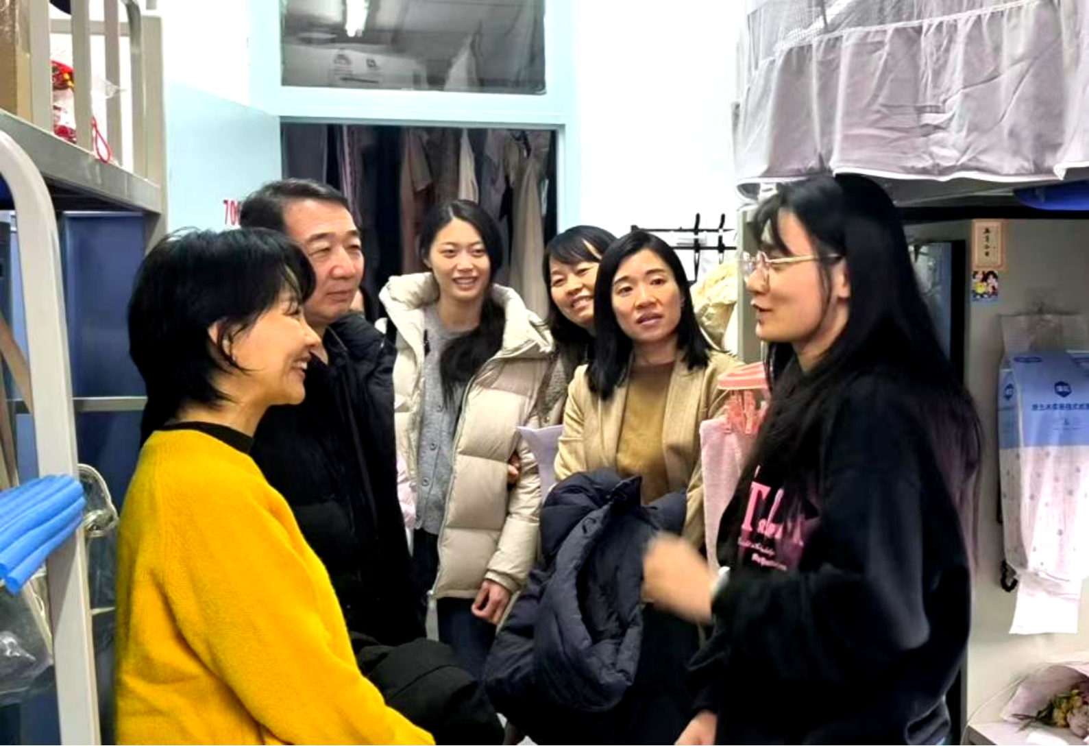 冬日的宿舍里,暖意融融。领导老师们先后走访了男女生宿舍楼的多个寝室,每到一处都与同学们亲切交流。“家乡是哪里的?”“科研工作推进还顺利吗?”“未来就业规划怎么样呀?” 一句句饱含关切的询问,一声声温暖贴心的叮嘱,瞬间拉近了与同学们的距离。